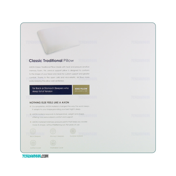 طراحی کلاسیک و ارتفاع استاندارد آن باعث شده تا بالش مموری فوم کلاسیک آکسون انتخابی ایدهآل برای کسانی باشد که میخواهند حس سنتی بالشهای قدیمی را حفظ کنند، اما به کیفیت خواب مدرن و حمایت طبی نیاز دارند.